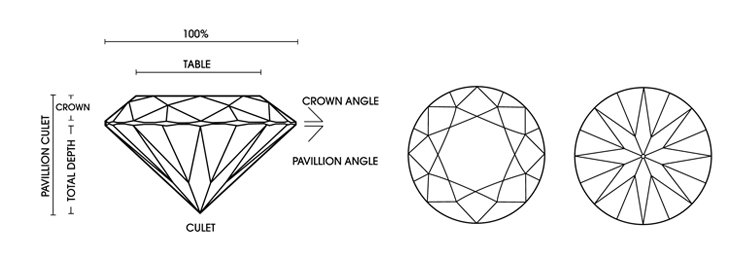 要了解鑽石切割,第一步是學習鑽石的部分。 下圖顯示了鑽石切割基本的比例。